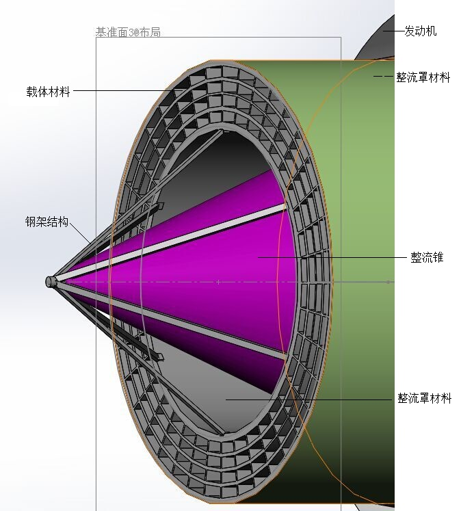 1、在材料选择方面,研究人员经过思考、探讨和查阅资料后,最终决定,在本装置的外部使用与GE90引擎外部整流罩材料一致的铝合金与原引擎连接。研究人员认为这样可以最大程度的降低因材料不一致、不亲和造成引擎在高空所具有的不确定及不安全因素。2、由三元催化原理,铂、铑、钯等贵重金属催化剂需要载体来安放,我们选用与汽车三元催化器载体材料相同的陶瓷载体来当做本装置的催化剂的载体,保持载体与催化剂最好的契合度。3、在本装置后部,由于内涵道排气原因,并且需要保持引擎结构的稳定性,研究人员认为,需要在本装置后部加上一定的支撑结构,用来保持稳定结构。在支撑结构材料的选定方面,研究人员决定采用航空航天用的超高强度钢,保证装置的绝对稳定与安全性。