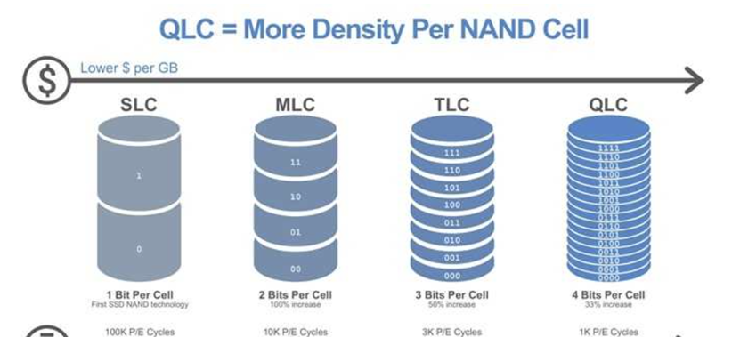 市面上固态硬盘颗粒主要分为四类SLC、MLC、TLC、QLC